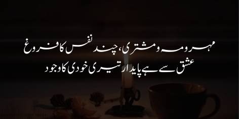 Iqbal farmate hain ke sooraj, chand aur mushtari jaise baray sitare sirf chand lamhon ki chamak damak rakhte hain aur aakhir-kar fana ho jate hain, lekin tumhari “Khudi” (ruh) ka wujood ishq-e-Ilahi ki badolat hameisha qaim rehne wala hai. Agar tumhare fun aur tumhari shakhsiyat ki banyad ishq par hai, to tumhein kainat ki in aarzi cheezon ke mit jane ka koi khauf nahi hona chahiye, kyunke tumhari Khudi abdi hai.