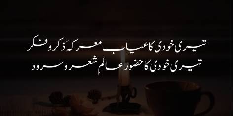 Jab insan ki Khudi ghayab ho jati hai (yani wo apni asal taqat bhool jata hai) to wo sirf khushk falsafon, bahas-o-mubahison aur zabani zikr-o-fikr ke jhagron mein ulajh kar reh jata hai. Lekin jab Khudi bedar aur hazir hoti hai, to wahi insan shair-o-mousiqi aur husn-o-jamal ki ek nayi aur zinda dunya takhliq kar deta hai. Goya Khudi ki mojoodgi hi fun mein haqiqi zindagi aur asar paida karti hai.