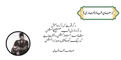 Aaj ka Musalman bhooka aur phate purane kapṛon wala hai, us ke aamaal dekh kar Hazrat Jibrail (A.S) ke dil mein bhi shor-o-ghul bapa hai۔ Aao! Hum ek nayi qoum ki buniyaad rakhein, kyunke yeh maujooda qoum poori dunya ke liye ek bojh ban chuki hai.