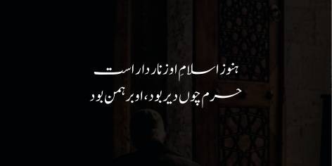 Iss she’r mein ‘Allāma Iqbāl “Nigahbān-e-Ḥaram” (maẕhabī pēshwā’ōñ, mutawalliyōñ yā Ummat ke amīnōñ) kī munāfiqat aur fikrī kajjī par kārī zarb lagā rahe hain. Woh farmāte hain ke afsōs! jō Ḥaram kā nigahbān kehlātā hai, woh dar-ḥaqīqat Dair (but-kada) kā mi’mār banā hu’ā hai. Ya’nī uske ‘amāl aur uskī pālisiyāñ Islām kī ḥifāz̤at ke bajā’e ghair-Islāmī aur bāṭil niz̤āmōñ kō taqwiyat dē rahī hain.