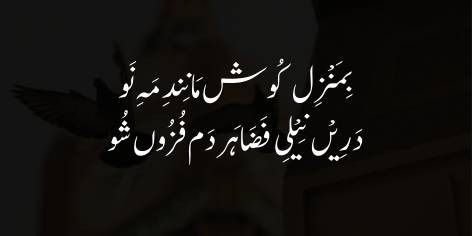 Allama Iqbal farmate hain ke ae insan! Apni manzil ko paane ke liye us tarah koshish kar jaise naya chand (hilal) har raat apni mehnat se barhta jata hai aur aakhir-kar poora chand ban jata hai. Is wasee aasman mein apni himmat aur jiddo-juhd se har lamha taraqqi kar. Agar tu is zamane mein izzat aur buland maqam chahta hai to us ka tariqa ye hai ke apne dil ka rishta Allah se jor le aur apni zindagi guzarne ke liye Hazrat Muhammad Mustafa (PBUH) ki sunnat aur shariat ko apna le.