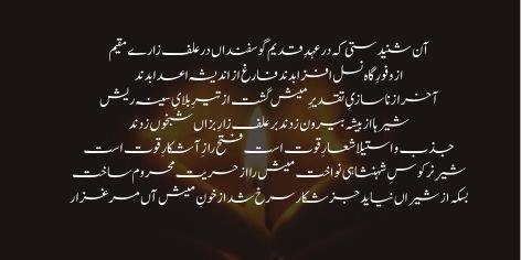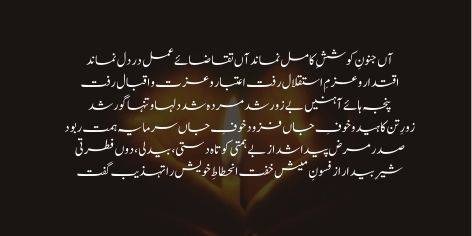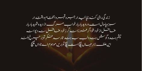 Aan junoon-e-koshish-e-kaamil namand, aan taqazaye amal dar dil namand. Iqtidar-o azm-e-istiqlal raft, itibar-o izzat-o iqbal raft. Panja-haye aahani be-zor shud, murda shud dil-ha-o tanha gor shud. Zor-e-tan kahid-o khauf-e-jan fuzood, khauf-e-jan sarmaya-e-himmat rabood. Sad maraz paida shud az be-himmati, kotah-dasti, be-dili, doun-fitrati. Sher-e-bedar az fusoon-e-mesh khuft, inhitat-e-khwish ra tehzeeb guft.