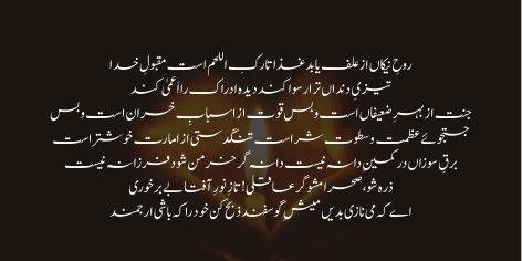Nara zad ae qaum-e-kazzab ashar, be-khabar az yaum-e-nahs-e-mustamir. Maya dar az quwwat-e-ruhanayam, bahr-e-sheran mursal-e-yazdanam. Deeda-e-be-noor ra noor amadam, sahab-e-dastoor-o mamoor amadam. Tauba az aamal-e-na-mahmood kun, ae zayan-andesh fikr-e-sood kun. Har ke bashad tund-o zor-awar shaqi ast, zindagi mustahkam az nafi-e-khudi ast.