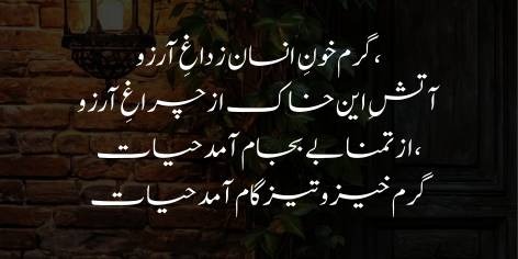 اقبال فرماتے ہیں کہ انسان کے اندر جو زندگی کی تڑپ اور خون کی گرمی ہے، وہ دراصل اس کی آرزوؤں اور مقصدِ حیات کی مرہونِ منت ہے۔ اگر انسان کے دل میں کچھ کر گزرنے کی تمنا نہ ہو تو وہ مٹی کے ایک ڈھیر سے زیادہ کچھ نہیں۔ یہ آرزو ہی ہے جو زندگی کے پیالے میں جوش بھرتی ہے اور انسان کو سستی چھوڑ کر منزل کی طرف تیزی سے بڑھنے پر مجبور کرتی ہے۔