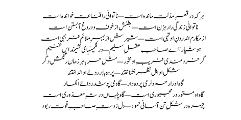 Truth is the twin of strength; if you are self-aware, this very awareness is your “Jam-e-Jam” (the world-revealing cup). Life is a field to be sown, and its harvest is power; the secret distinction between right and wrong is determined by strength. If a claimant possesses the capital of power, his claim requires no further proof or argument. Through power, even falsehood assumes the grandeur of truth; it regards itself as right by negating the truth of others. From its touch, poison turns into the water of Kausar; if it calls good “evil,” then evil it becomes. O you who are ignorant of the duties of the trust (the self), consider yourself better than both worlds. Become aware of the mysteries of life, and become a “oppressor” (stern) and “ignorant” (unmoved) toward everything other than God. Open your eyes, ears, and lips, O wise one! If you do not then see the path of truth, you may mock me.