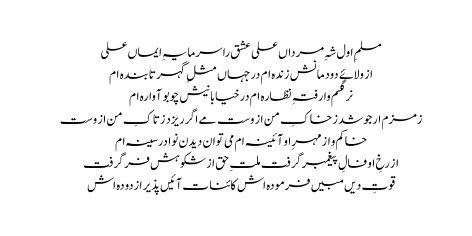 اگر میری شاعری کی خاک سے زمزم جیسا پاکیزہ چشمہ پھوٹتا ہے یا میرے کلام کی بیل سے معرفت کی شراب ٹپکتی ہے، تو یہ سب آپؓ سے میری عقیدت کا فیض ہے۔ میں تو محض خاک ہوں مگر آپؓ کی محبت نے مجھے آئینے کی طرح روشن کر دیا ہے، یہاں تک کہ میرے سینے کے اندر چھپے ہوئے نغموں کو بھی دیکھا جا سکتا ہے۔ حضورﷺ نے آپؓ کے چہرے سے اچھا شگون لیا اور ملتِ اسلامیہ کو آپؓ کے رعب و جلال سے شان و شوکت ملی۔ آپؓ کے ارشادات دینِ مبین کے لیے قوت کا باعث ہیں اور اس کائنات نے آپؓ ہی کے گھرانے سے آئین و دستور حاصل کیا ہے۔