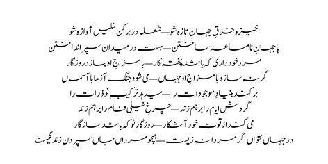 Khiz o khallaq-e-jahan-e-taza sho, shola dar bar kun Khalil-awaza sho.