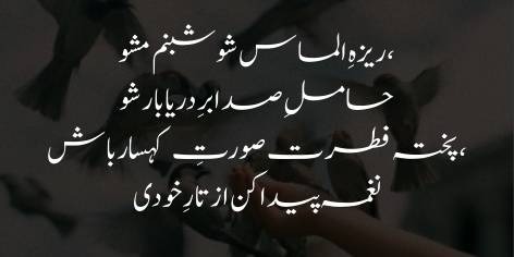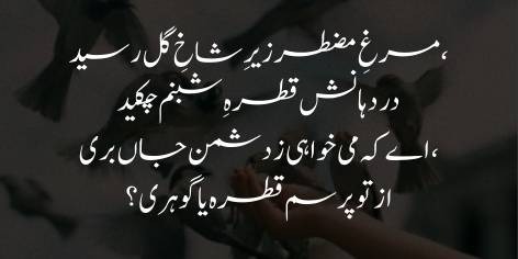 Wo be-qarar parinda us tahni ke neeche pohancha aur shabnam ka wo qatra us ke munh mein gir gaya, yani shabnam apni kamzori ki wajah se fana ho gayi. Iqbal yahan ek bara sawal karte hain ke agar tum dushmanon se bachna chahte ho aur apni baqa chahte ho to khud se poocho ke tum mit jaane wale qatray ki tarah ho ya sakht heeray ki tarah?