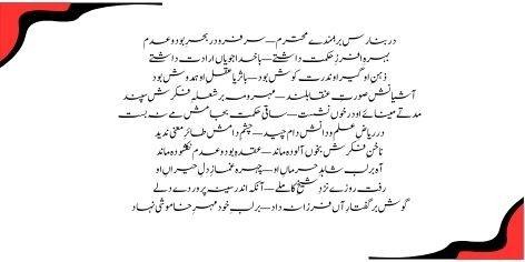 Dar Banaras barhamande muhtaram, sar-faro dar bahr-e-bod o adam. Bahra-e-afraz-e-hikmat dashte, ba khuda-joyan iradat dashte. Zehn-e-oo geera o nudrat kosh bood, ba Surayya aql-e-oo ham-dosh bood. Ashiyan-ash surat-e-anqa buland, muhr o mah bar shoala-e-fikrash sipand. Muddate meena-ye-oo dar khoon nishast, saqi-e-hikmat ba-jamash may na bast. Dar riyaz-e-ilm o danish daam cheed, chashm-e-damash tair-e-ma’ani na-deed. Nakhun-e-fikrash ba-khoon aaluda maand, uqda-e-bod o adam na-kshuda maand. Aah bar lab shahid-e-hirman-e-oo, chehra ghammaz-e-dil-e-hairan-e-oo. Raft roze nazd-e-shaikh-e-kaamile, ankay andar seena parwarday dile. Gosh bar guftar-e-aan farzana daad, bar lab-e-khud muhr-e-khamoshi nihad.