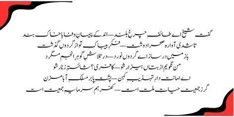 Guft Shaikh ay taif-e-charkh-e-buland, andkay paiman-e-wafa ba khak band. Ta-shudi awara-e-sahra doshat, fikr-e-bebak-e-tu az gardoon guzasht. Baz mein darsaz ay gardoon-navard, dar talash-e-gohar-e-anjum magard. Man na-goyam az butaan bezar sho, kafiri? shaista-e-zunnar sho. Ay amanat-dar-e-tehzeeb-e-kuhan, pusht-e-pa bar maslak-e-aaba mazan. Gar zi jamiyat hayat-e-millat ast, kufr ham sarmaya-e-jamiyat ast.