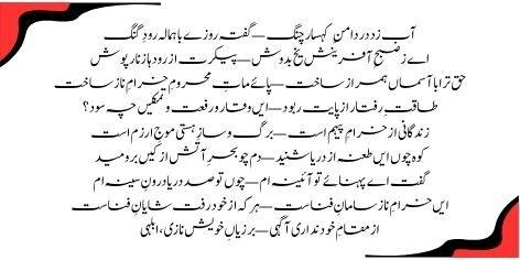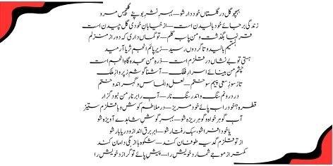 Bah-chu gul dar gulistan khod-dar sho, bahr-e-nashr-e-bu paye gul-cheen maro. Zindagi bar-jaye khod baleedan ast, az khayaban-e-khudi gul cheedan ast. Qarn-ha bugzasht o man pa-ba-gilam, tu guman dari ki door az manzalam. Hastiyam baleed o ta gardoon raseed, zir-e-payam anjum-e-Surayya aarameed. Hasti-e-tu be-nishan dar qulzum ast, zarra-e-man sajda-gah-e-anjum ast. Chashm-e-man binaye asrar-e-falak, aashna gosham zi parwaz-e-malak. Ta zi soz-e-say-e-paiham sokhtam, la’l o almas o gohar andokhtam. Dar daronam sang o andar sang naar, aab ra bar naar-e-man nabood guzar. Qatra? khod ra ba paye khod mareez, dar mulatam kosh o ba qulzum sateez. Aab-e-gohar khwah o gohar reeza sho, bahr-e-gosh-e-shahiday aaweza sho. Ya khod afrasho, subuk raftar sho, abr-e-barq andaz o darya baar sho. Az tu qulzum gadya-e-tufan kunad, shakwa ba az-bagi-e-daman kunad. Kamtar az moujay shumard khuish ra, pesh-e-paye tu gurazad khuish ra.