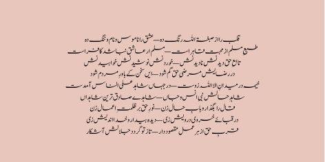 Qalb ra az Sibghat-ullah rang deh, Ishq ra namoos o naam o nang deh. Tab-e-Muslim az muhabbat qahir ast, Muslim ar aashiq na-bashad kafir ast. Tabe-e-haq deedan-ash na-deedan-ash, khurdan-ash nushidan-ash khabidan-ash. Dar raza-yash marzi-e-Haq gum shawad, een sukhan kay bawar-e-mardom shawad. Khaima dar maidan-e-illa-Allah zost, dar jahan shahid-alan-naas amad-ast. Shahid-e-halash Nabi-e-ins o jan, shahiday sadiq-tareen-e-shahidan. Qaal ra bugzar o baab-e-haal zan, noor-e-Haq bar zulmat-e-amaal zan. Dar qaba-ye-khusravi darwish zi, deeda-beedar o Khuda-andeesh zi. Qurb-e-Haq az har amal maqsud dar, ta zi tu gardad jalal-ash ashkar.