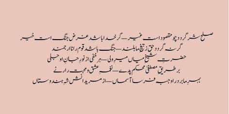 Sulh shar gardad chu maqsud ast ghair, gar Khuda bashad gharaz jang ast khair. Gar na gardad Haq zi tegh-e-ma buland, jang bashad qoum ra na-arjumand. Hazrat-e-Shaikh Mian Mir-e-Wali, har khafi az noor-e-jan-e-oo jali. Bar tareeq-e-Mustafa muhkam paday, naghma-e-ishq o muhabbat ra ranay. Rutba-ash iman-e-khak-e-shahr-e-ma, masha’l-e-noor-e-hidayat bahr-e-ma. Bar dar-e-oo jubba-farsa aasman, az muridan-ash shah-e-Hindustan.