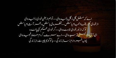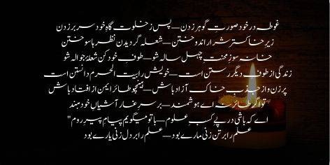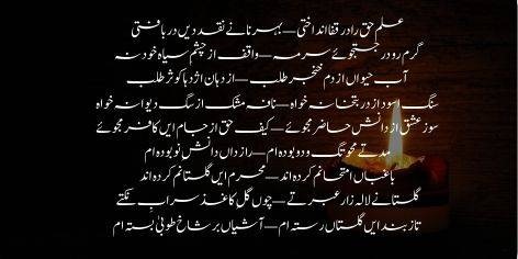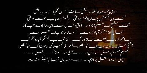 Ilm-e-haq ra dar qafa andakhti, behr-e-nanay naqd-e-deen dar-baakhti. Garm-ru dar justuju-e-surma, waqif az chashm-e-siyah-e-khod na. Aab-e-haiwan az dam-e-khanjar talab, az dahan-e-azhdaha Kauthar talab. Sang-e-aswad az dar-e-butkhana khwah, nafa-e-mushk az sag-e-deewana khwah. Soz-e-ishq az danish-e-hazir ma-joye, kaif-e-haq az jaam-e-een kafir ma-joye. Muddate mahv-e-tag-o-du budah am, raaz-dan-e-danish-e-no budah am. Baghbanan imtihanam kardah and, mahram-e-een gulistanam kardah and. Gulistane lala-zar-e-ibratay, chun gul-e-kaghaz sarab-e-nuktay. Ta zi-band-e-een gulistan rastah am, ashiyan bar shakh-e-Tuba bastah am.