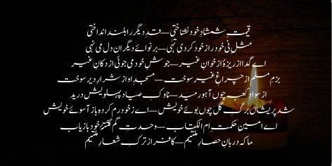 Qimat-e-shamshad-e-khod nashnakhti, qad-e-digar ra buland andakhti. Misl-e-nay khod ra zi khod kardi tahi, bar nawaye digaran dil mi nehi. Ay gada az rezaye az khwan-e-ghair, josh-e-khod mi jui az dukan-e-ghair. Bazm-e-Muslim az chiragh-e-ghair sokht, masjid-e-oo az sharar-e-dair sokht. Az sawad-e-Kaaba chun ahoo rameed, nawak-e-sayyad pehlooyash dareed. Shud pareshan barg-e-gul chun booy-e-khwaish, ay zi khod ram karda baz asooy-e-khwaish. Ay ameen-e-hikmat-e-Umm-ul-Kitab, wahdat-e-gum gashtaye khod bazyab. Ma ke darban-e-hisar-e-millatim, kafir az tark-e-sha’ar-e-millatim.