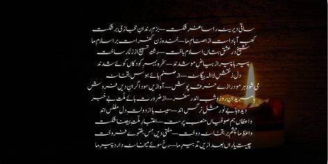 Saqi-e-deerina ra saghar shikast, bazm-e-rindan-e-Hijazi bar shikast. Kaaba abad ast az asnam-e-ma, khanda zan kufr ast bar Islam-e-ma. Sheikh dar ishq-e-butan Islam bakht, rishta-e-tasbeeh az zunnar sakht. Peer-ha peer az bayaz-e-moo shudand, sakhra behr-e-kodakan koye shudand.