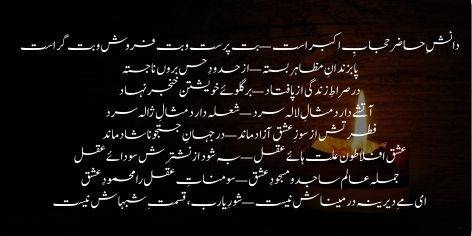 Danish-e-hazir hijab-e-akbar ast, but-parast o but-farosh o but-gar ast. Pa ba-zindan-e-mazahir basta-ay, az hudood-e-hiss baroon na-justa-ay. Dar sirat-e-zindagi az pa futad, bar-galoo-e-khwaishtan khanjar nihad. Atishe darad misal-e-lala sard, shola darad misal-e-zhala sard. Fitratash az soz-e-ishq azad mand, dar jahan-e-justuju nashad mand. Ishq-e-Aflaton-e-illat-haye-aql, beh shawad az nishtarash sauda-e-aql. Jumla-e-alam sajid o masjood-e-ishq, Somnath-e-aql ra Mahmood-e-ishq. Een may-e-deerina dar meenash neest, shor-e-Ya-Rabb, qismat-e-shabhash neest.