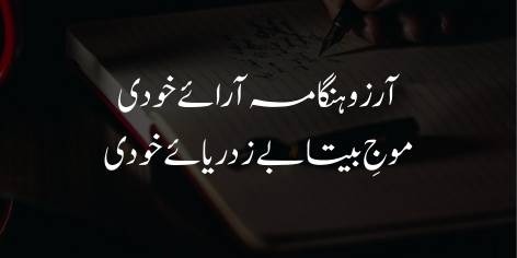 Khudi ek samandar hai aur aarzoo is samandar ki woh be-qarar lahar hai jo khamoshi ko hangamay mein badal deti hai. Insaan ki Khudi us waqt tak mutaharrik nahi hoti jab tak us ke andar koi tarap ya lahar paida na ho. Yehi be-chaini insaan ko bare karname anjam dene par uksati hai.