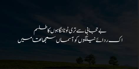 Warna soorat-e-hal yeh thi ke main fiza mein maujood neele badlon ko hi aasman samajh baitha tha. Tumhare jalwe ki roshni se mujh par haqeeqat zahir hui.
