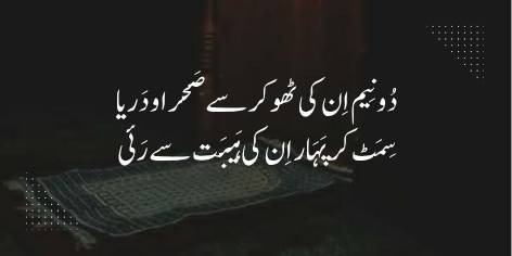 This couplet, from Allama Iqbal’s poem “Farmaan-e-Khuda (Command of God to the Angels),” illustrates the extraordinary power of action and will possessed by the true believer (Ghazi). God describes the strength of these special servants by saying that “deserts and rivers are split into two (do-neem) by their determined kick (thoukar),” meaning their power of action and firm resolve are so intense that even the great obstacles of nature cannot stand against them.