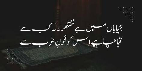 This couplet highlights Allama Iqbal’s philosophy of Khudi (Self) and the urgent need for renewed zeal within the Muslim community. Iqbal states that the Lala flower (a symbol of freedom, honour, and self-reliance) has been waiting for a long time in the garden (Khiyaban), waiting for the moment when it can attain its true brilliance and identity. The poet asserts that “this Lala requires its robe (qaba) to be dyed with the blood of an Arab.