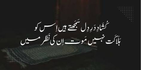 This couplet, from Allama Iqbal’s poem “Farmaan-e-Khuda (Command of God to the Angels),” describes the true believer’s (Ghazi’s) concept of death and martyrdom. God states that “these Momin and Ghazi understand death not as destruction or ruin (halakat), but as the opening of the heart’s door (Kushād-e-Dar-e-Dil).” This means that in their view, death is actually a means to spiritual progress, liberation from the confines of the physical world, and reunion with the Real Beloved (God).