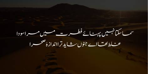 وہ اس شعر میں اپنے اس جذباتی احساس کا اظہار کرتے ہیں جو خود ان کے اپنے اندازے سے بھی کہیں زیادہ ہے۔ وہ کہتے ہیں کہ عام طور پر عشق کے جنون میں صحرا کو ہی پناہ گاہ سمجھا جاتا ہے، لیکن میرے لیے تو صحرا کی وسعت بھی ناکافی ہے۔