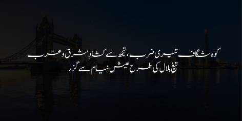 Is ibarat mein Allama Iqbal Musalmanon se mukhatib ho kar kehte hain ke tumhari “La Ilaha Illallah” (Allah ke siwa koi ma’bood nahi) ki zarb mein itni taqat hai ke woh paharon ko bhi tor kar rakh sakti hai.