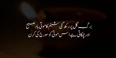 Is ibarat mein Allama Iqbal kehte hain ke phoolon ki pattiyon par shabnam ke qatre is tarah se chamak rahe hain jaise subah ki hawa ne unhein phoolon par motiyon ki tarah saja diya ho.