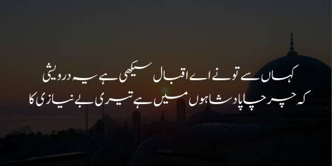 اس نظم کے آخری شعر میں علامہ اقبال کہتے ہیں کہ بادشاہوں کو بھی اس بات پر یقیناً حیرت ہوتی ہے کہ میں نے یہ بے پرواہی اور درویشی کہاں سے سیکھی ہے۔