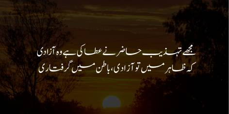 Is ibarat mein Allama Iqbal kehte hain ke is sari soorat-e-haal mein aik baat bilkul saaf hai ke aaj ki tehzeeb ne insaan ko azadi toh de di hai, lekin agar ghaur se dekha jaye toh yeh azadi darasal ghulami se bhi zyada buri hai.