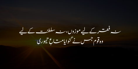 Shair farmate hain ke woh qaum jis ne Taimur jaisi azeem shakhsiyat ki wirasat (shan o shaukat aur taqat) ko kho diya hai, woh na toh faqr (darweshi) ke liye achi hai aur na hi hukoomat o saltanat ke liye. Yaani aisi qaum mein na faqiri ki rooh baqi hai aur na hi hukmarani ki salahiyat.