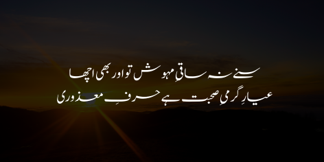 Iqbal kehte hain ke agar haseen saqi (jise mehboob ka isteara samjha ja sakta hai) meri maazrat ko na sune aur israr kare toh yeh aur bhi acha hai. Kyunke kisi mehfil ki asal raunaq aur garmajoshi isi mein hai ke jab koi maazrat kare toh use qabool na kiya jaye.