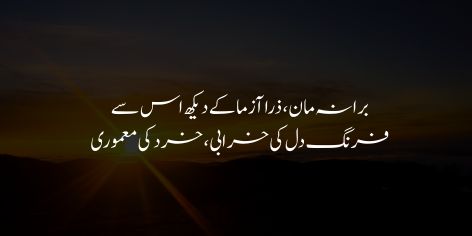Shair kehte hain ke meri baat ka bura na man’na, zara ise aazma kar dekho ke maghribi tehzeeb bazahir aql (khird) ko taraqqi deti hai, lekin yeh dil ko kharab aur khali kar deti hai. Yaani maghribi tehzeeb mein aqli taraqqi toh hai magar roohani aur qalbi sukoon nahi.