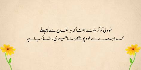 اس شعر میں وہ فرماتے ہیں کہ اگر انسان اپنی “خودی” (اپنی ذات کی پہچان اور عزتِ نفس) کو انتہائی بلندی اور عروج پر لے جائے، تو اللہ تعالیٰ (خالقِ دو جہاں) اس پر اتنے مہربان ہوتے ہیں کہ اپنی مرضی (رضا) اور اس انسان کی سوچ میں ایک طرح کی ہم آہنگی (یکجہتی) پیدا کر دیتے ہیں۔