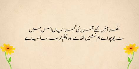 Shair kehte hain ke jab main ne apne mehboob ki khoobsurat aankhon ki gehraiyon mein jhaankne ki koshish ki, toh mujhe asal soorat-e-haal ka kuch andaza hua, aur main yeh jaan saka ke uske dil mein meri kitni qadr-o-qeemat hai.