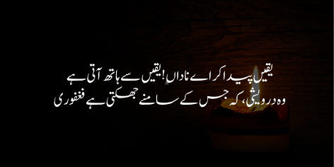 Shair kehte hain ke “Pukhta aur mukammal yaqeen (Yaqeen-e-Kamil) ke baghair faqeeri ya darweshi bhi hasil nahi hoti” (Yaani roohani kamyabi ke liye yaqeen sabse ahem hai).