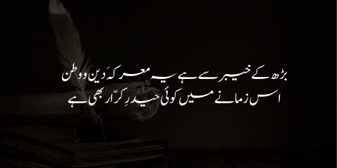 Iqbal kehte hain ke “Aaj bhi Deen aur Watan ke muqable mein Khaibar se kahin zyada bara aur mushkil maarka maujood hai” (Murad: Jadeed daur ke fikri, siyasi aur maaddi challenges).