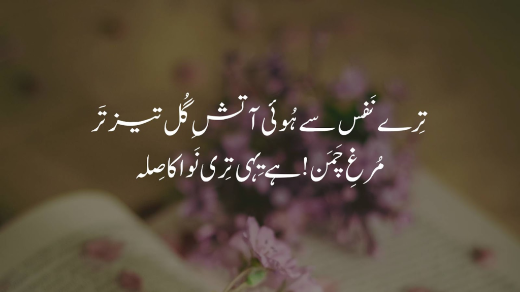Allama Iqbalؒ is shair mein fard ki aawaaz ki taaqat aur uss ke ta’ameeri asraat (constructive effects) ko bayan karte hain, jahan Murgh-e-Chaman (bagh ka parinda, yaani aik bedaar aur fa’al shakhs) ko mukhatib kiya gaya hai. Shair kehte hain ke Aye chaman ke parinday! Yeh teri baaton, naghmon aur paigham (Nawa) ka Sila (reward) hi hai ke tumhari garm saans (Tere Nafs) se phoolon ki aag (Aatish-e-Gul) aur bhi tez aur shola-war ho gayi hai.