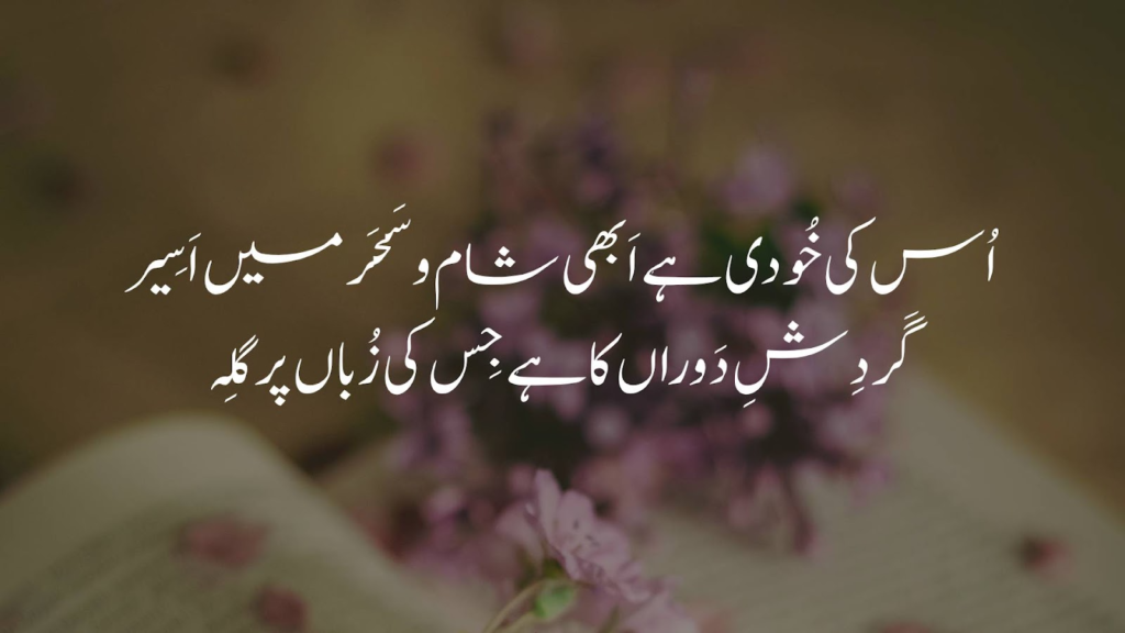 Allama Iqbalؒ is shair mein aik aisay shakhs ki kamzori aur na-kaami ko bayan karte hain jo maadi waqt ke dairey mein qaid ho kar reh gaya hai. Woh kehte hain ke jis shakhs ki zuban par har waqt zamanay ki gardish (gardish-e-dauran) yaani haalaat ki kharabi aur mushkilaat ka shikwa (gila) rehta hai, dar-asal uss ki Khudi (asal shakhsiyat aur self-power) abhi tak dunyawi waqt ke chakkar (shaam-o-sehar) mein hi qaid (aseer) hai. Muraad yeh hai ke woh shakhs khud ko waqt aur haalaat ka ghulam samajhta hai, woh apni baatini quwwat ko pehchaan nahi paaya, isliye woh sirf qismat par etraaz karta rehta hai aur amali jad-o-jehad karne se qaasir rehta hai.