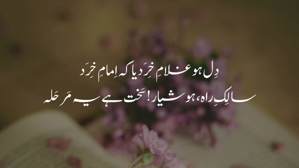 Allama Iqbalؒ is shair mein aql (khirad) aur imaan ke tawaazun ke hawalay se Raah-e-Haq ke musafir (Saalik-e-Raah) ko khabardaar kar rahe hain. Woh kehte hain ke tum apni manzil ki taraf chalne wale Aye musafir! Hoshiyaar ho jao, yeh rasta bohat mushkil aur karrha marhala hai.
