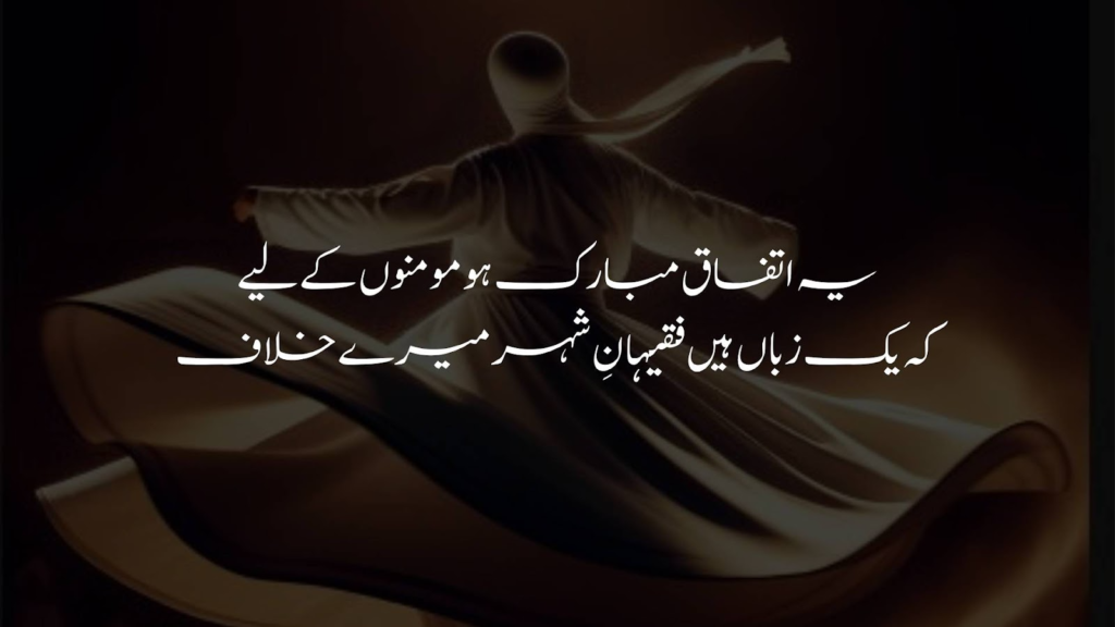 علامہ اقبالؒ یہاں اہلِ علم و مذہب کے جمود اور اختلاف پسندی پر ایک نہایت تیکھا طنز کرتے ہوئے اپنی بات شروع کرتے ہیں۔ وہ طنزیہ انداز میں اہلِ ایمان کو مبارکباد دیتے ہیں کہ شہر کے قاضی اور ملاؤں کا طبقہ، جو عام طور پر کسی بھی بات پر متفق نہیں ہوتا اور ہر چیز کو اختلافی مسئلہ بنائے رکھتا ہے (یہاں تک کہ خدا اور رسول اکرم ﷺ کو بھی)، وہ کم از کم ایک معاملے پر تو متفق ہوا ہے۔ اور یہ اتفاقِ رائے کس بات پر ہوا ہے؟ صرف میری فکر اور میرے نظریات سے اختلاف کی بنیاد پر۔ اقبالؒ کے نزدیک، اس شدید اختلافی طبقے کا محض ان کی ذات کی حد تک کسی ایک معاملے پر ذہنی ہم آہنگی (اتفاق) پیدا کر لینا کسی معجزے سے کم نہیں ہے۔ دراصل، وہ اس بات کی طرف اشارہ کر رہے ہیں کہ ان طبقوں کی اصل کمزوری یہ ہے کہ یہ اختلاف کو ہی اپنا شیوہ بنا چکے ہیں، اور میرا کلام ان کے روایتی جمود کو توڑتا ہے، اسی لیے یہ سب مجھ پر متفق ہو گئے ہیں۔