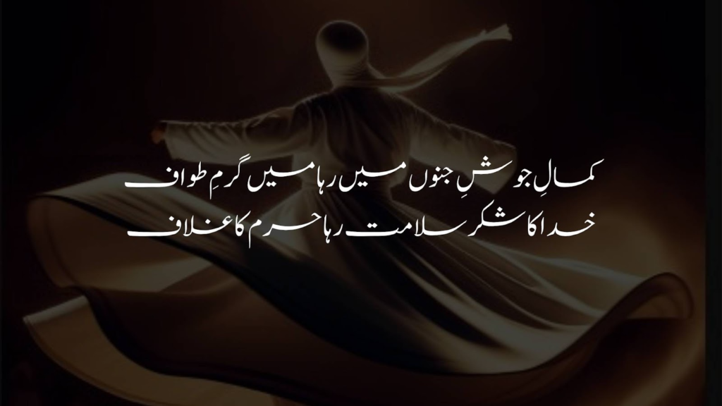 Yeh ishq itna taaqatwar aur be-khud kar dene wala tha ke agar iss haalat mein Haram ka ghilaaf (Ka’aba’s covering) sahih-o-salaamat reh gaya aur mujh se koi gustaakhi sarzad na hui, toh yeh sirf Allah Ta’ala ki rehmat aur karam hai. Dar-asal, Iqbalؒ is baat par shukr-e-Khuda-wandi (gratitude to God) ada kar rahe hain ke aalam-e-deewangi mein bhi Allah ne unhein adab ka daaman thaame rakhne ki taufeeq di, warna ishq ke ghalbe (domination of love) mein insaan ki aql par qaboo nahi rehta aur woh kya kuch kar guzarta hai, iska andaaza lagana mushkil hai.