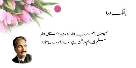 (علامہ اقبال، مسلمانوں کی عالمگیر قومیت بیان کرتے ہیں) ہمارے لیے چین بھی ہمارا ہے، عرب بھی ہمارا ہے، اور ہندوستان بھی ہمارا ہے۔ ہم مسلمان ہیں، اور عقیدے کی رو سے یہ پوری دنیا ہی ہمارا وطن ہے۔ (مراد یہ ہے کہ ایک مسلمان جغرافیائی حدوں میں قید نہیں ہوتا بلکہ پوری دنیا کو اپنا گھر سمجھتا ہے۔)