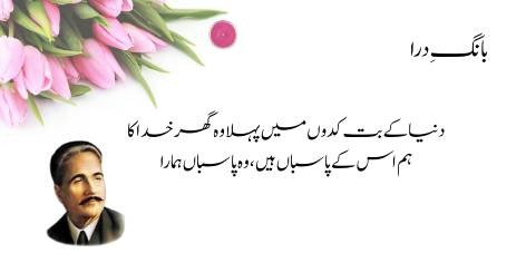 Jab duniyā mein har ṭaraf but khāne hī but khāne the, tab Khuda kā wōh pehlā ghar (Khāna Ka‘ba) ta‘mīr huā. Ham Musalmān us ke muḥāfiz hain, aur wōh (Ka‘ba kī rūḥānī qūwat) hamārī ḥifāẓat kartī hai.