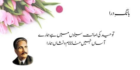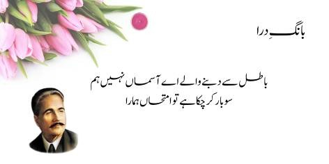(Allāma Iqbāl, sābit qadamī aur bē-khaufī bayān karte hain) Ai āsmān! Ham wōh log nahīn jo jhūṭ aur bāṭil ke sāmne dab jāyeñ aur ḍar jāyeñ. Tum ne khud ek bār nahīn, sau bār hamārā imtiḥān le kar yeh bāt dekh lī hai.