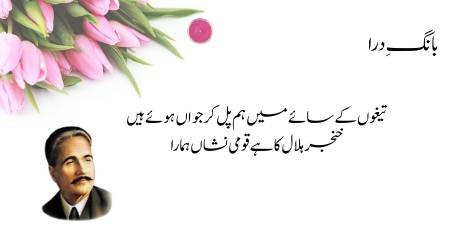 Yeh ek ḥaqīqat hai ke ham (hamāre aslāf) tēġhōñ kī chā’ōñ mein pal kar baṛe hue hain (ya‘nī jihād aur bahādrī hamāre khamīr mein shāmil hai). Aur hilāl (pehlī tārīḳh kā chāñd) jo keh khanjar se mushābah hai, wōh hamārā qaumī nishān hai.