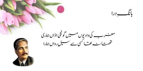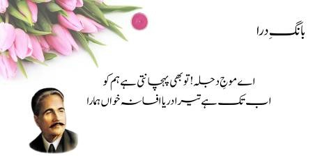 (Allāma Iqbāl, Baġhdād kī ‘aẓmat bayān karte hain) Ai Daryā-e-Dijla kī leher (mauj-e-Dijla)! Tum bhī hameñ acchī ṭaraḥ pehchāntī hō. Tumhārā daryā toh āj tak hamārī ‘aẓmat kī kahāniyāñ sunā rahā hai.