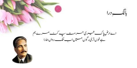 (Allāma Iqbāl, sarzamīn-e-Ḥijāz se ‘aqīdat bayān karte hain) Ai Pāk sarzamīn (arẓ-e-pāk, murād Ḥijāz)! Ham tumhārī ‘izzat aur iḥtirām kī khāṭir shahīd hue. Āj bhī tumhārī ragōñ mein hamārā hī khūn dauṛ rahā hai.