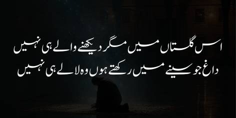 Ya’ni har taraf māyūsī aur be-chainī hai. Iss sārī sūrat-e-hāl mein, ziyāda se ziyāda bas itnā hī ho rahā hai ke maiñ apne hī jigar kā khūn pītā rehtā hūñ (ya’ni andarūnī ghamōñ aur dukhōñ ko bardāsht kartā hūñ aur apnī hī mehnat-o-koshishōñ kā phal dekh kar kuṛhtā rehtā hūñ).